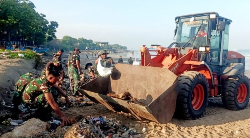 BADUNG – Dalam rangka Karya Bakti Terpadu TNI, Pemkab Badung dan Dinas Lingkungan Hidup dan Kebersihan (DLHK) Badung, dalam mengatasi sampah Laut di pesisir pantai Kuta dan pantai Kedonganan. Pembersihan sampah dipesisir Laut pantai tepatnya pagi pukul 07.00 Wita, bertempat di Pantai Kuta dan Pantai Kedonganan, puluhan prajurit TNI dan DLHK Badung serta Desa adat setempat, melanjutkan pembersihan dalam penanganan sampah dipesisir laut pantai. Kuta, Badung, Bali. Senin, (17/02/2025)