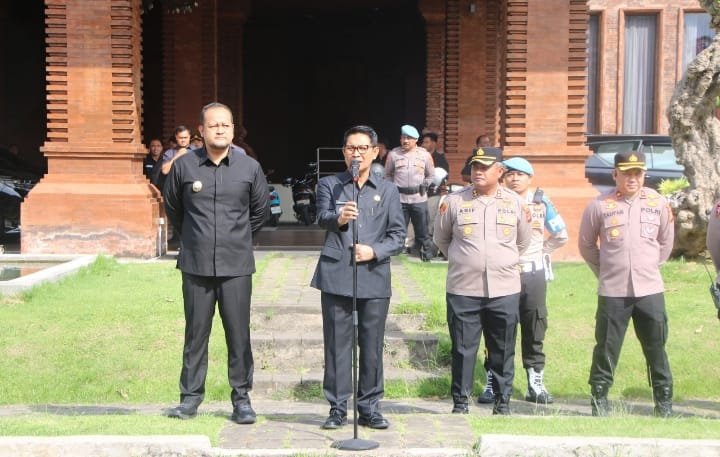 Kapolres Badung AKBP M. Arif Batubara, SH, SIK, MH, M.Tr.Opsla., saat memimpin apel pengamanan berlokasi di depan Balai Budaya Giri Natha Mandala Puspem Kab. Badung menyampaikan bahwa setiap personel tidak under estimate terhadap situasi dan pengamanan dilakukan secara humanis serta mengedepankan pendekatan persuasif.