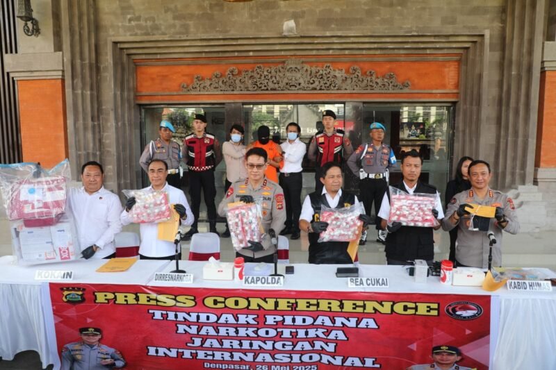 Nasionalklik.com – Saat Konferensi Pers di depan para awak media bertempat di Loby Mapolda Bali, Kapolda Bali Irjen Pol Daniel Adityajaya S.H., S.I.K., M.Si., didampingi Kabid Humas Kombes Pol Ariasandy S.I.K dan Diresnarkoba Kombes Pol Radiant S.I.K., M.Hum., serta perwakilan dari Bea Cukai Bali, Senin 26 mei 2025.