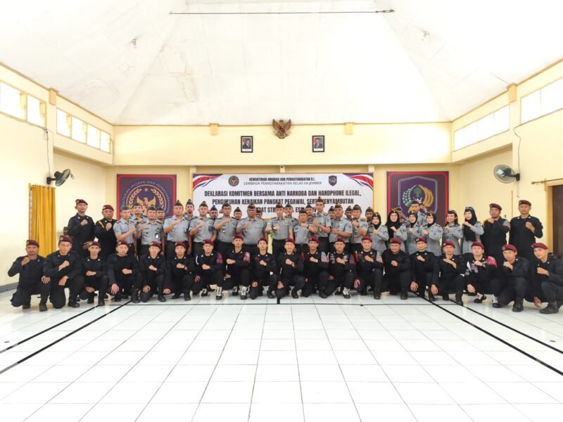 Jember, nasionalklik.com – Lembaga Pemasyarakatan (Lapas) Kelas IIA Jember menggelar “Deklarasi Komitmen Anti Narkoba dan Alat Komunikasi Ilegal”, bertempat di Aula Utama. Acara ini sekaligus dirangkaikan dengan “Penyematan Kenaikan Pangkat Pegawai”, dimana sebanyak 4 orang pegawai dinaikan pangkatnya satu tingkat lebih tinggi. Kegiatan ini dipimpin langsung oleh Kepala Lapas (Kalapas) Jember, diikuti seluruh Pejabat Struktural dan Pegawai, pada Senin (26/05/2025).