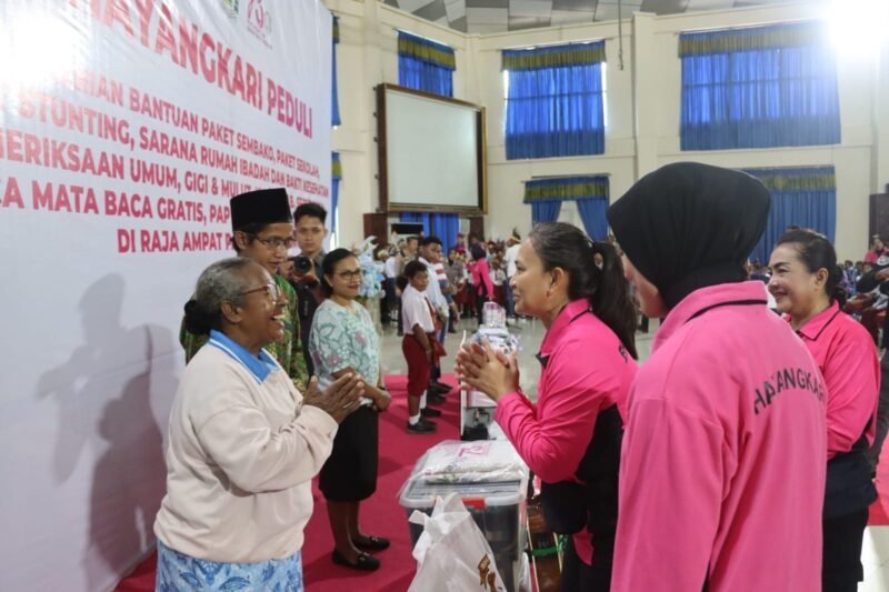Papua Barat, Nasionalklik.com – Ketua Umum Bhayangkari, Ny. Juliati Sigit Prabowo berkunjung ke Mapolres Raja Ampat, Polda Papua Barat Daya, Kamis (19/6/2025).Dalam kunjungan tersebut, Ny. Juliati Sigit Prabowo memimpin kegiatan Bhayangkari Peduli di Gedung Pari Waisai Raja Ampat.Kegiatan Bhayangkari Peduli kali ini diselenggarakan dengan pemberian sembako, paket stunting, dan paket sekolah, sarana rumah ibadah, bhakti kesehatan pemeriksaan umum, gigi dan mulut, KIA atau KB, Laboratorium Sederhana, Kacamata Baca Gratis, PAP SMEAR, dan Khitanan Massal, kepada masyarakat di wilayah sekitar.“Program Bhayangkari Peduli ini adalah bentuk perhatian kami terhadap kondisi sosial masyarakat, khususnya yang membutuhkan. Semoga bantuan yang kami berikan dapat meringankan beban mereka, baik dalam memenuhi kebutuhan sehari-hari, penanganan stunting pada anak-anak, maupun dalam mendukung pendidikan,” ujar Ny. Juliati Sigit Prabowo, Jumat (20/6/2025).Kegiatan ini mendapat sambutan hangat dari warga sekitar. Sebagai organisasi sosial yang memiliki perhatian besar terhadap kesejahteraan masyarakat, Ny. Juliati memastikan Bhayangkari akan terus berupaya hadir di tengah-tengah kesulitan masyarakat dengan berbagai kegiatan sosial. “Gerakan ini bertujuan untuk meningkatkan kualitas hidup dan mendukung pemerintah dalam penanggulangan masalah sosial, seperti stunting dan kesulitan ekonomi,” tegas Ny. Juliati Sigit Prabowo. (Byu)