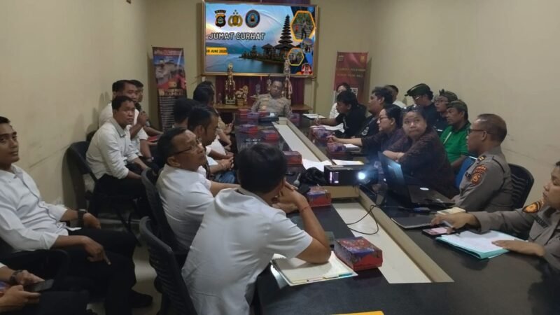 Polda Bali, Nasionalklik.com – Kepolisian Daerah (Polda) Bali intens melaksanakan program Jumat Curhat. Kali ini, Polda Bali menggelar di Ruang Rapat Bidkum Polda Bali, Jumat, (20/06/2025). Komisaris Besar Polisi Musni Arifin, S.I.K.,M.H. Dirpamovit Polda Bali hadir dalam kegiatan Jumat Curhat tersebut dan turut di dampingi oleh Akbp Ni Nyoman Suartini, S.I.K.,M.M.Tr., Wadir Ditpamovit Polda Bali, Akbp A.A Gede A. Pujanggayas, S.S., Kasubdit Audit Ditpamovit Polda Bali. “Jumat Curhat ialah program oleh Mabes Polri, guna menampung aspirasi masyarakat. Adapun kegiatan Jumat Curhat ialah membangun informasi dua arah dan bisa terbangun kolaborasi untuk menjaga Kamtibmas yang kondusif,” ujar Ditpamovit Polda Bali.Dirpamovit Polda Bali juga menyampaikan, Jumat Curhat yaitu program mabes polri, guna menampung keluhan atau aspirasi masyarakat adapun kegiatan Jumat Curhat ialah membangun informasi dua arah dan bisa terbangun kolaborasi untuk menjaga kamtibmas yg kondusif, dan menyampaikan pembahasan permasalahan pariwisata untuk mewujudkan Pariwisata Bali yang Bersinergritas dan berkelanjutan kepada pengusaha penyewaan venue keramaian komersil, tutupnya. (Byu)