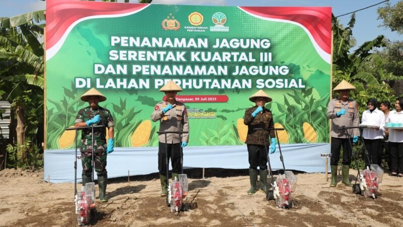 Nasionalklik.com, Polda Bali – Kepala Kepolisian Daerah Bali, Irjen Pol. Daniel Adityajaya, S.I.K., M.Si., didampingi Wakapolda Bali, Brigjen Pol. Komang Sandi Arsana, S.I.K., M.H., serta para Pejabat Utama Polda Bali, melaksanakan kegiatan penanaman jagung secara serentak yang dipusatkan oleh Mabes Polri, Kegiatan ini berlangsung di lingkungan Asrama Polisi Abian Timbul, Denpasar, Rabu (9/7/2025).